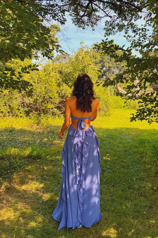 Haze Blue Halter A-Line 3D Floral Ruffle Dress