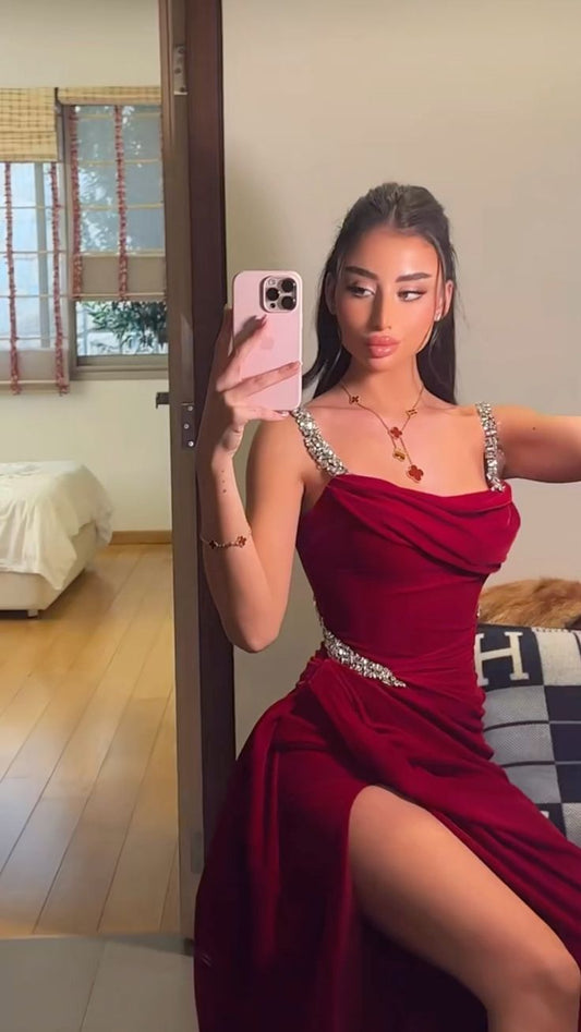 Sexy Mermaid Straps Red Satin With Slit Beads