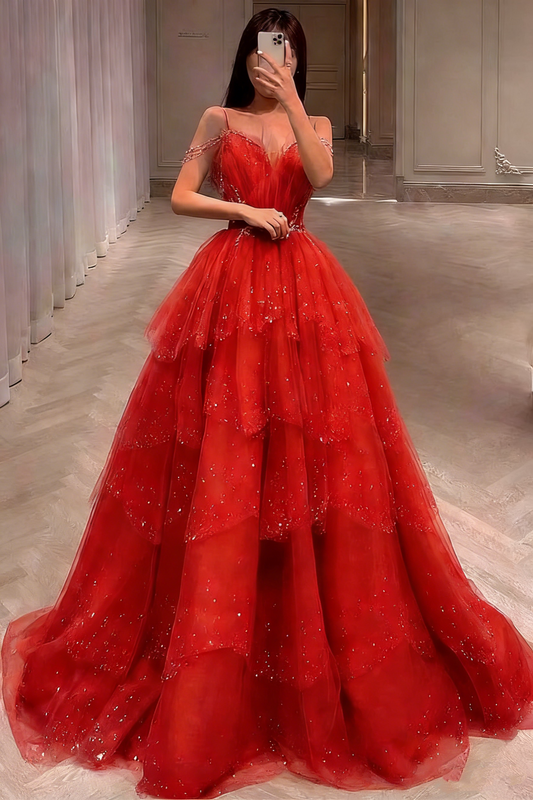 Red Ruffled Tiered Tulle Maxi Ball Gown