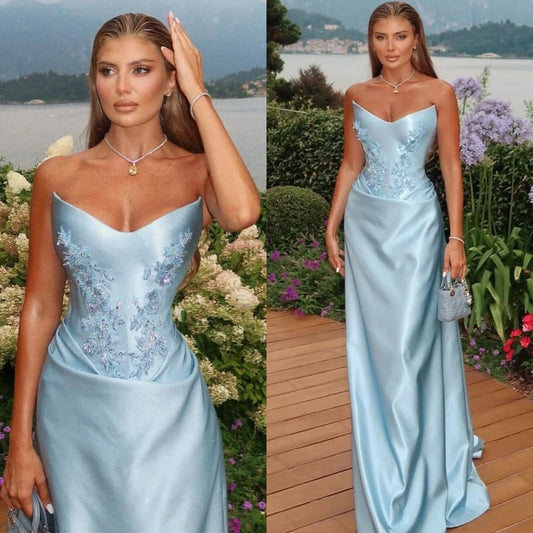 Mermaid Strapless Blue Satin With Appliqueds Lace Long Prom Dress