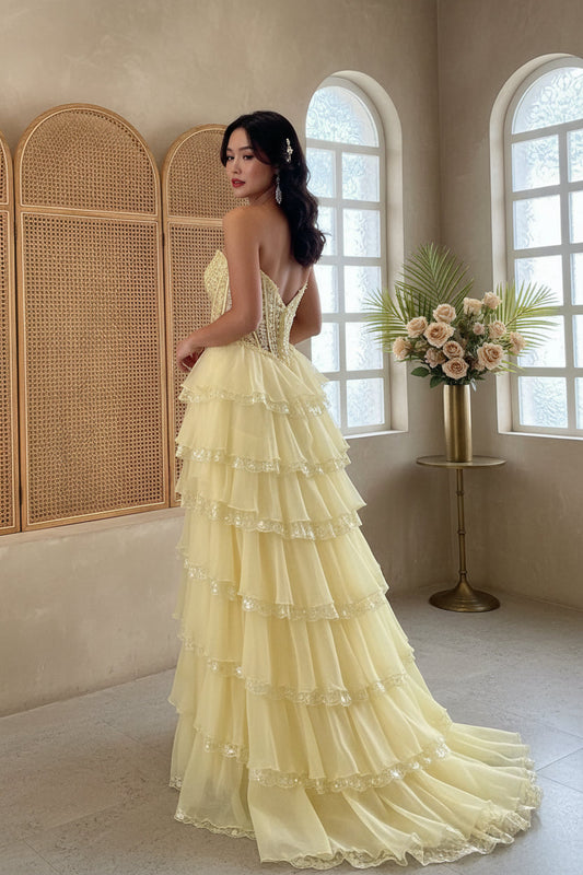 Glamorous Strapless Lace Corset Tiered Tulle Prom Dress