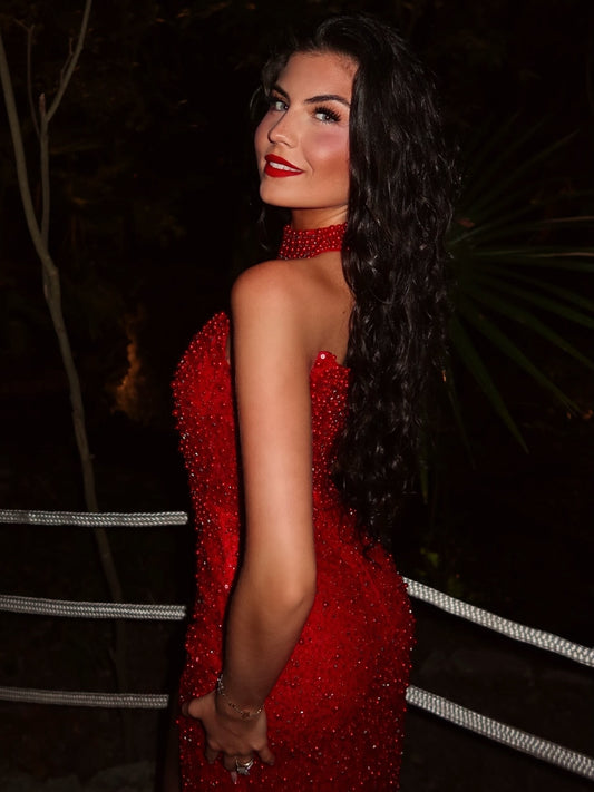 Unique Red Strapless Split Beaded Prom Dress
