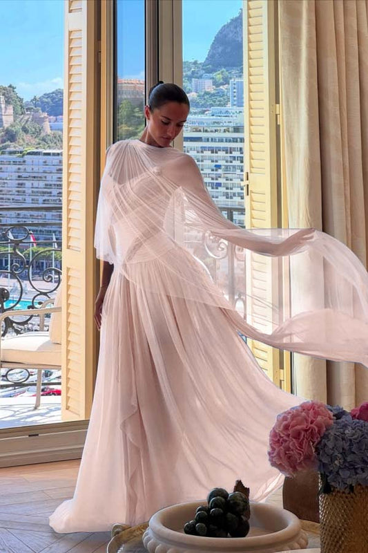 Square Neck Half Sleeves A-Line Ruched Floor-Length Evening Dress