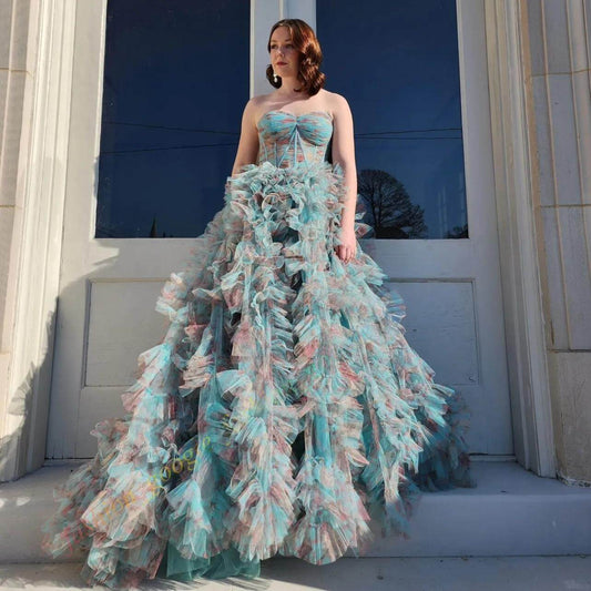 Sweetheart Off-Shoulder Sleeveless Floor-Length Print-Tulle Pleated Tiered Prom Dress