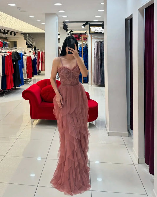 Sweetheart Spaghetti Straps Sleeveless Floor-Length Pleated Tulle Tiered A-Line Prom Dress