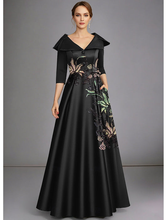 A-Line V-Neck 3/4 Length Sleeves Floor-Length Mother Of The Bride Dress