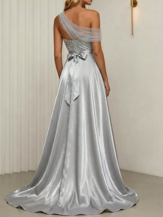 One Shoulder Sleeveless Bow Sequins Sparkle Evening Dress