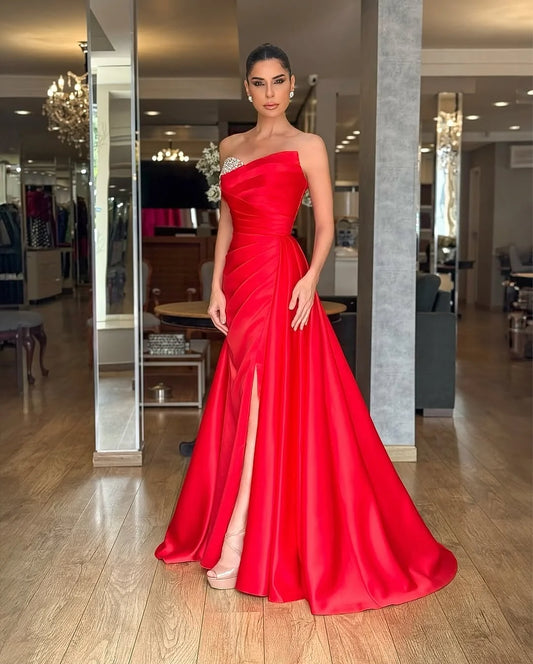Red Satin Strapless Sleeveless Long Pleated A-Line Prom Dress With Corset