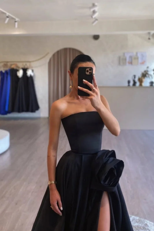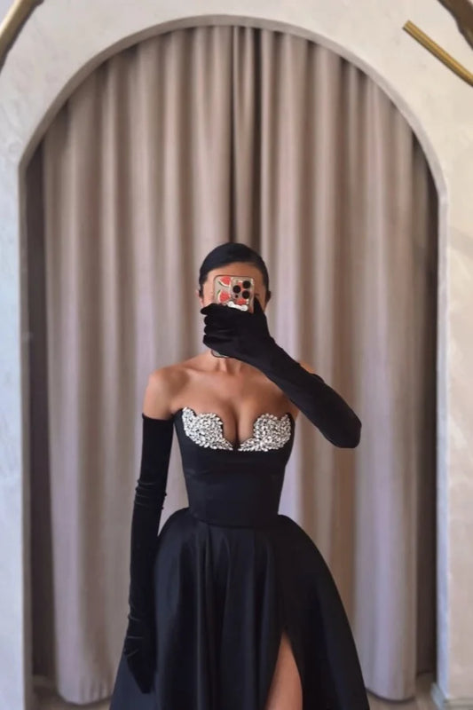 Formal Black Strapless Split Beaded A-Line Prom Dress With Velvet Gloves