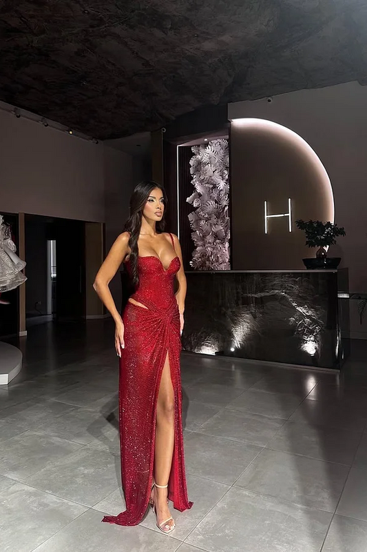 Red Gorgeous Split Sequins Spaghetti-Straps Prom Dress