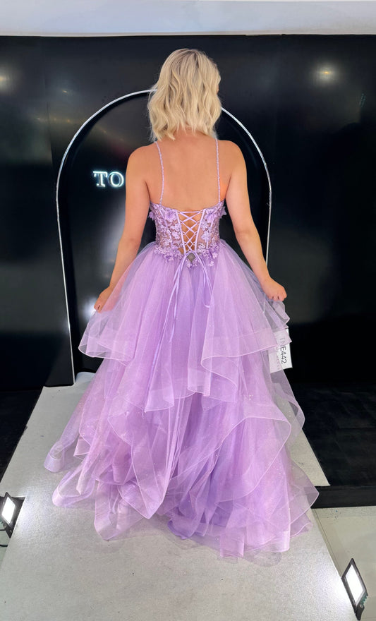 Glitter Lace Appliques Ruffle Tiered Pink Long Prom Dress