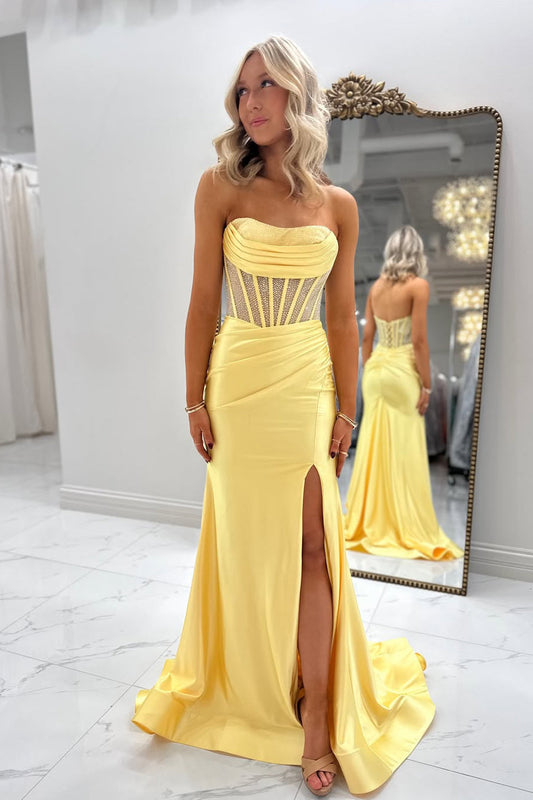 Mermaid Strapless Lilac Sequins Long Prom Dresses with Slit