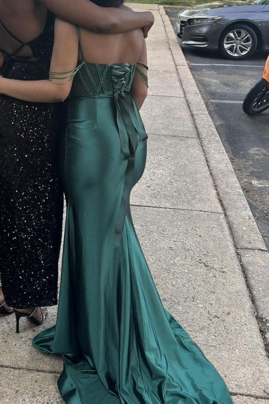 Elegant Green Straps V-Neck Appliques Satin Backless Prom Dress