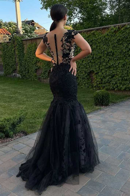 Classy Black Deep V-Neck Lace Appliques Mermaid Formal Prom Dress