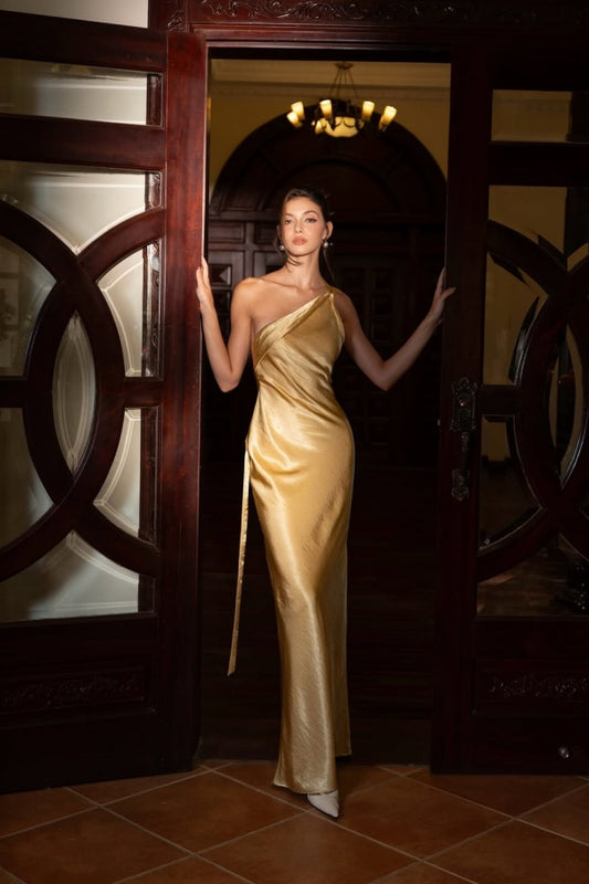 Classic Champagne One Shoulder Prom Dress Sleeveless with Flower