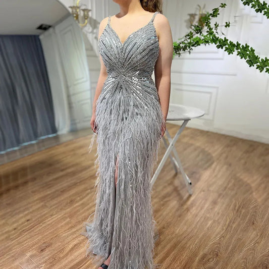 Luxury Classy blue Feathers Beaded Mermaid Prom Dress with Split