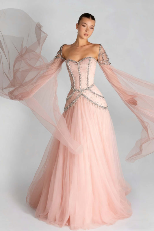 Off the Shoulder Sleeveless Long Prom Dress With Beading Tulle