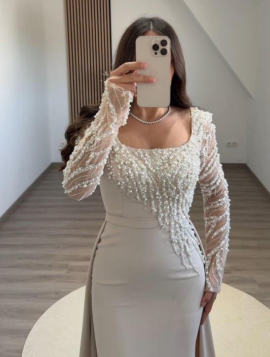 Elegant Long Sleeves Scoop Empire-Waist Pearls Satin Formal Dress