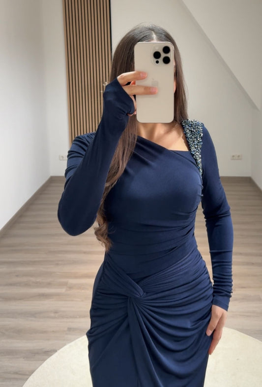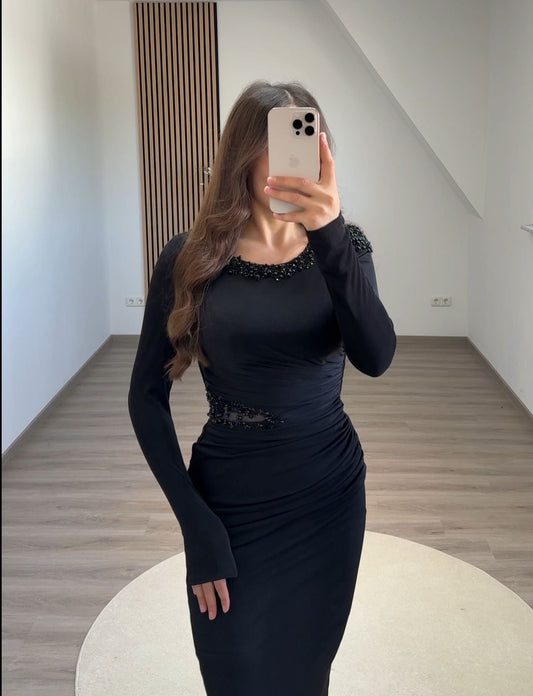 Long Sleeves Mermaid High Neck Prom Dress with Sequins Ruched Evening Party Dress