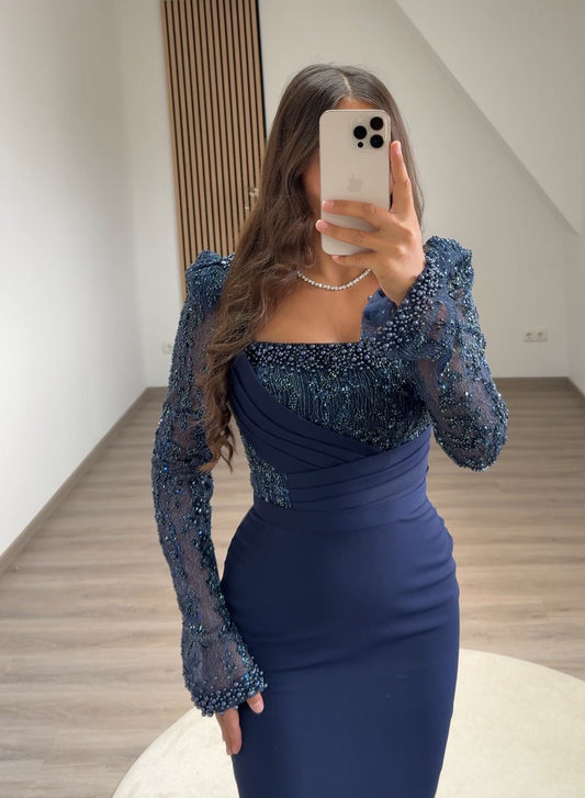 Long Sleeves High Neck Pearls Ruched Evening Dress