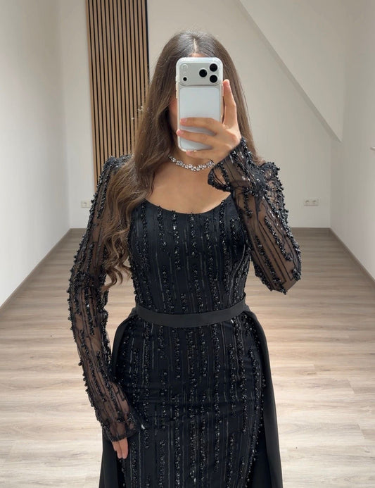 Long Sleeves V-Neck Prom Dress with Beads Sweep Train Evening Dress