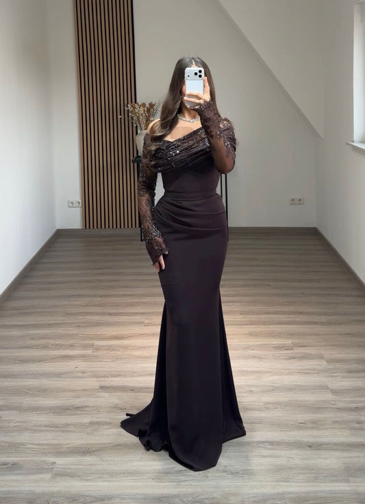 Stunning Long Sleeves Off-The-Shoulder Mermaid Evening Dress With Sweetheart Beadings ED0468