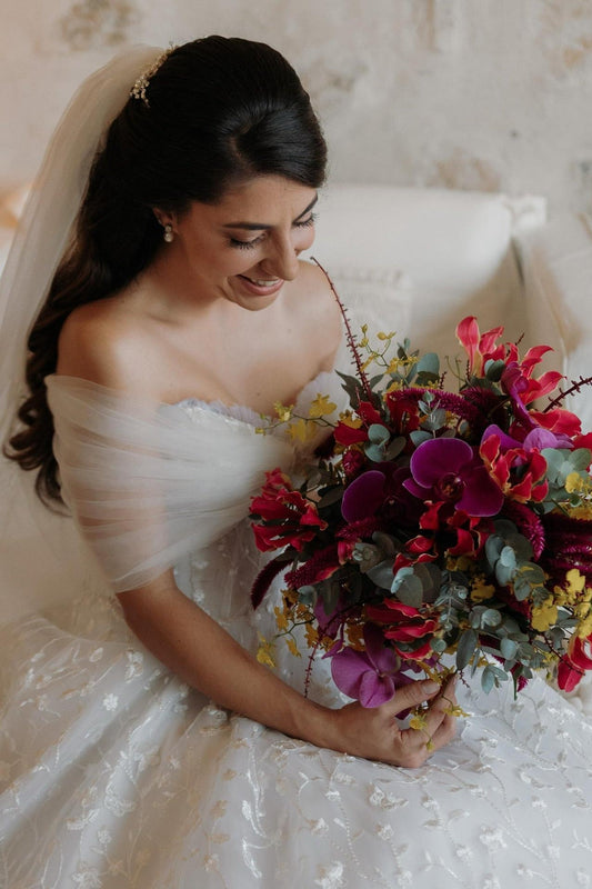 Ivory Off the Shoulder Wedding Dress Long Sleeves Bridal Dress with Panel Train