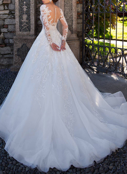 Dreamy A-Line Illusion Neck Long Sleeves Sweep Train Tulle Wedding Dresses With Appliques LaceDreamy A-Line Illusion Neck Long Sleeves Sweep Train Tulle Wedding Dresses With Appliques LaceDreamy A-Line Illusion Neck Long Sleeves Sweep Train Tulle Wedding