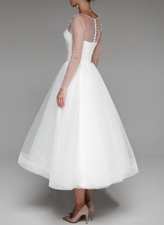 Elegant Beading Illusion Neck Long Sleeves A-Line Tea-Length Tulle Wedding DressesElegant Beading Illusion Neck Long Sleeves A-Line Tea-Length Tulle Wedding DressesElegant Beading Illusion Neck Long Sleeves A-Line Tea-Length Tulle Wedding DressesElegant B