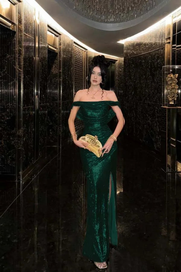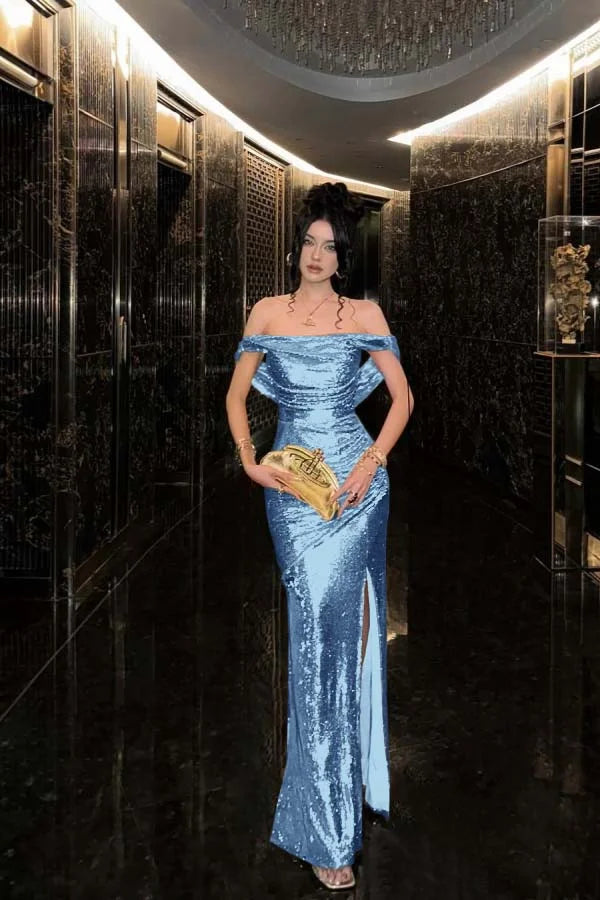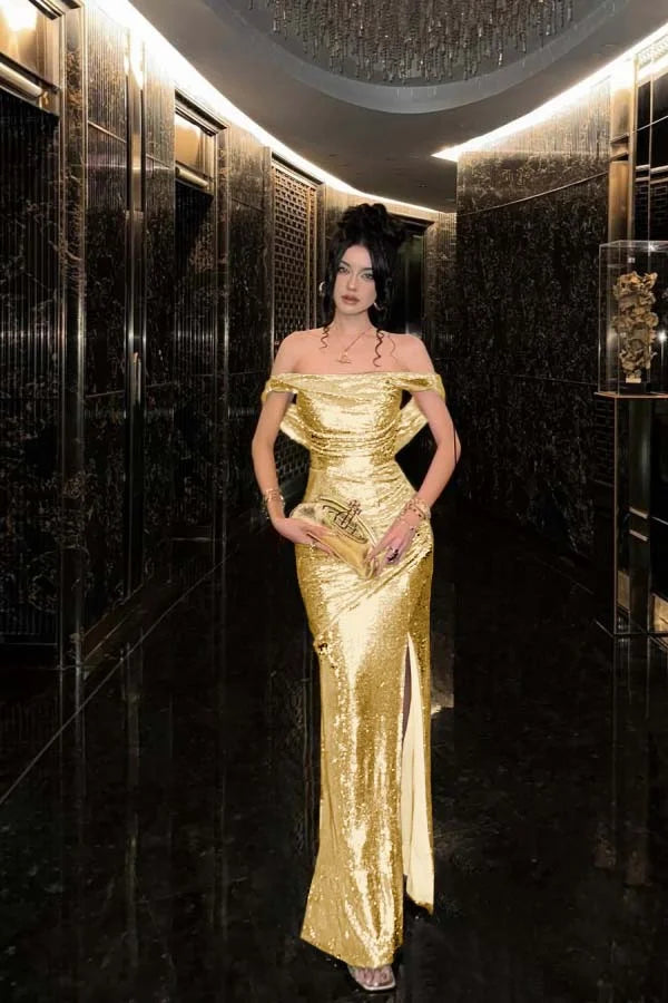 Champagne Solid Sequins Split Prom Dress