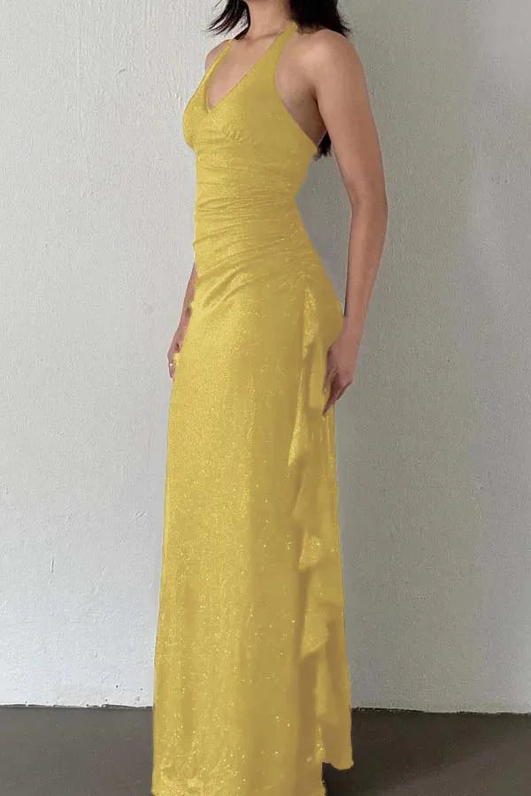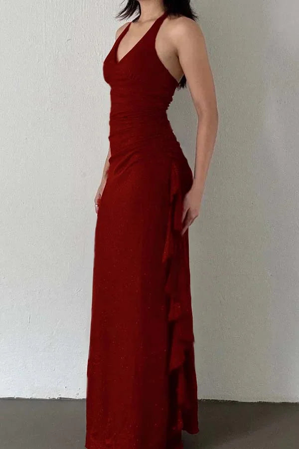 Charming V-Neck Halter Burgundy Ruffles Prom Dress ZT0740
