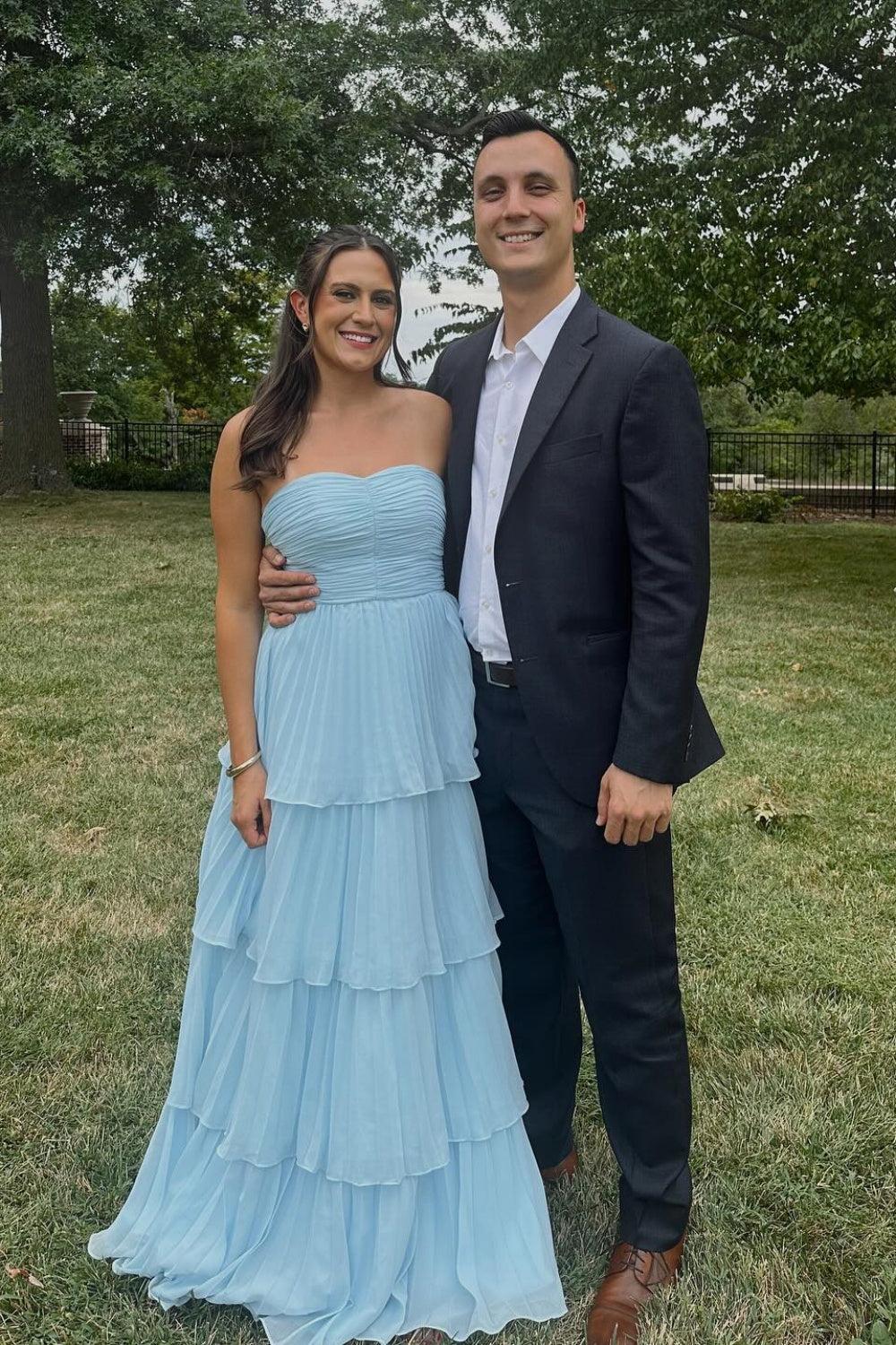 Make a stunning entrance in this elegant prom dress designed for those who appreciate timeless sophistication. The sweetheart neckline and strapless silhouette create a flattering, romantic look, while the tiered A-line skirt adds dimension and movement. Crafted from flowing pleated chiffon, this floor-length gown drapes beautifully and offers comfortable wear throughout the evening. Perfect for prom, formal events, or any special occasion where you want to feel confident and graceful.