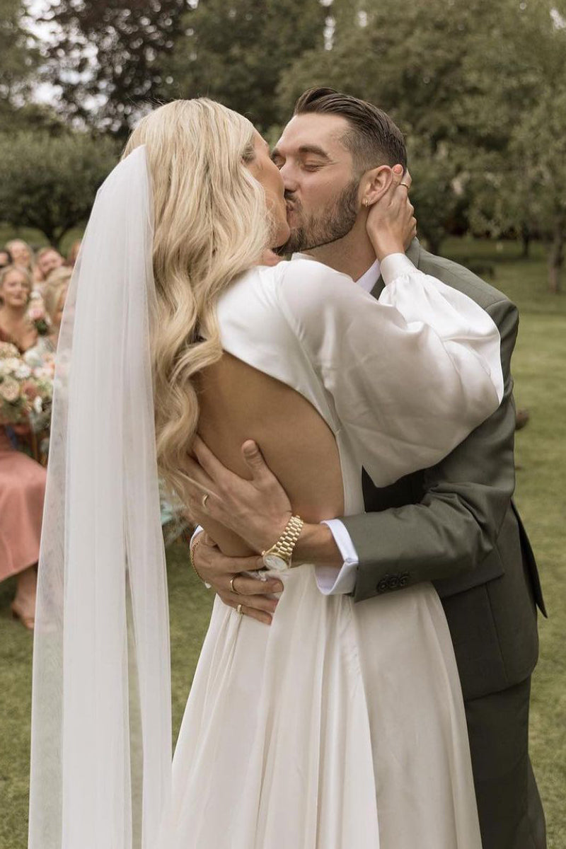Elegant A-Line Deep V Neck Silk Satin Long Sleeves Wedding Dress