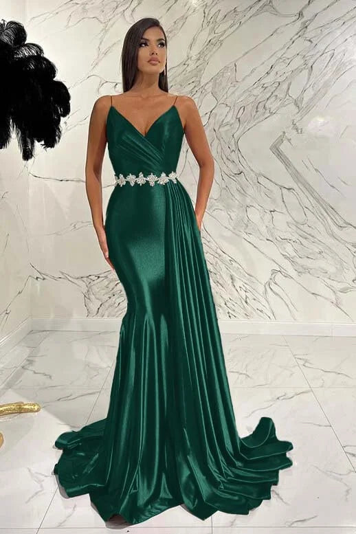 Elegant Red Spaghetti-Straps Deep V-Neck Mermaid Evening Dress With Belt Ruffles ED0472