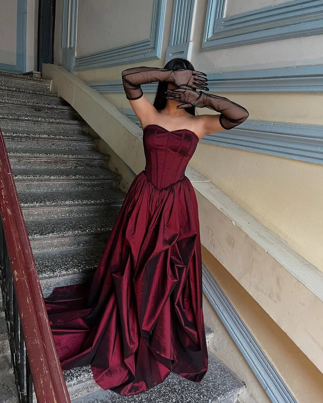 Make a stunning entrance in this sophisticated strapless burgundy A-line prom dress. The sweetheart neckline and fitted bodice create an elegant silhouette that flows gracefully with the voluminous skirt. Paired with coordinating gloves, this gown delivers timeless glamour and refined poise. Perfect for prom, formal galas, or any black-tie occasion where you want to command attention with understated luxury and impeccable style.