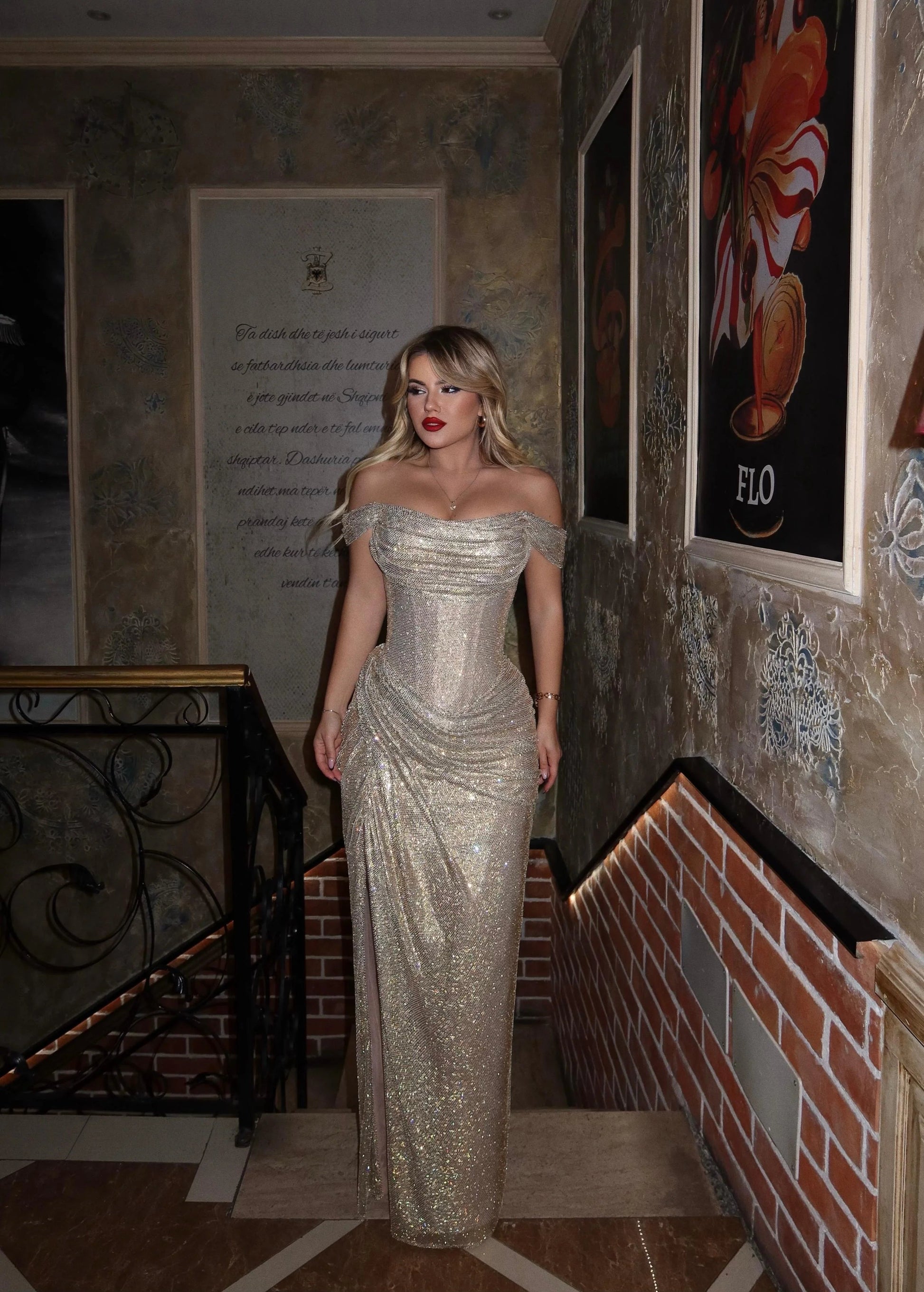 Make a statement at prom in this show-stopping mermaid gown! Featuring an off-the-shoulder neckline and sleeveless design, this dress is covered in shimmering sequins that catch the light with every move. The fitted bodice flows into a dramatic mermaid silhouette, while a daring side slit adds movement and flair. Perfect for twirling on the dance floor, this sparkly stunner ensures you'll be the most glamorous guest in the room. Shine bright like the diamond you are!