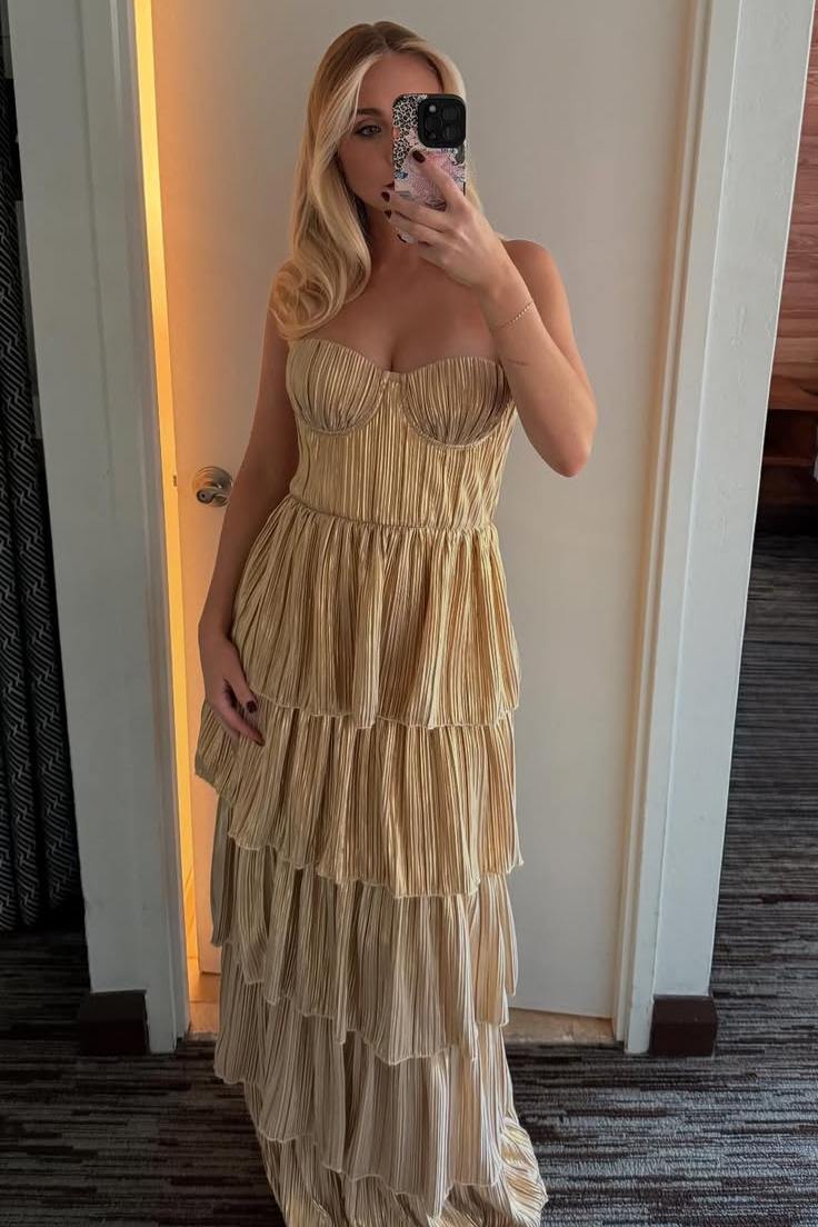 Golden Strapless Metallic Multi-Layered A-Line Sweetheart Prom Dress