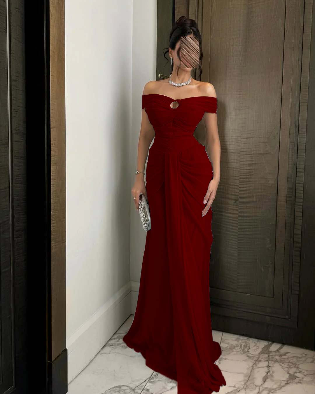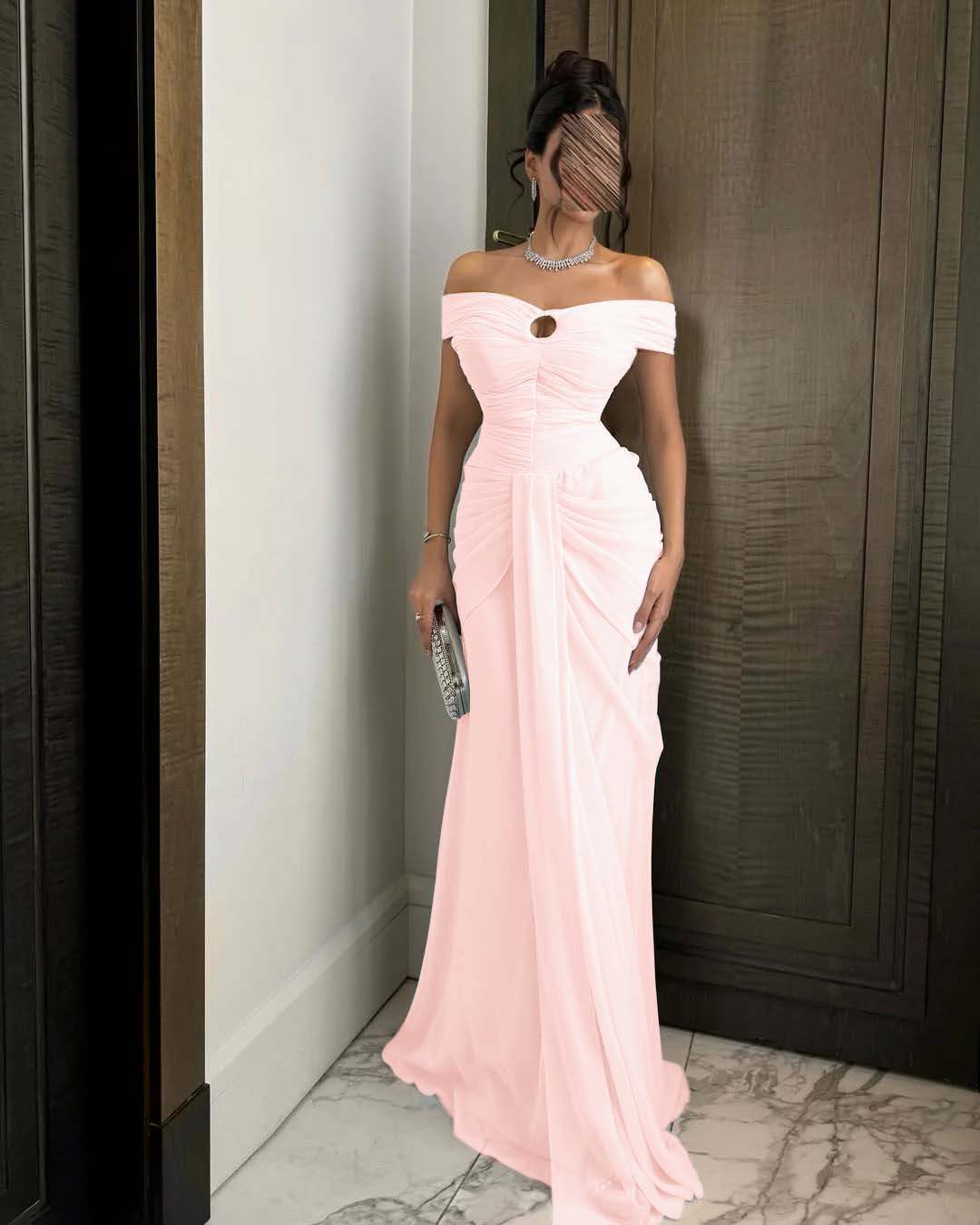 Make a stunning entrance in this elegant chiffon mermaid prom dress. The off-the-shoulder neckline and strapless design create a sophisticated silhouette that flatters and captivates. Crafted from flowing chiffon, this sleeveless gown features a graceful mermaid cut that hugs your curves before sweeping into an impressive floor-length train. Perfect for prom night, formal galas, or any black-tie occasion where you want to command attention with timeless glamour and refined style.