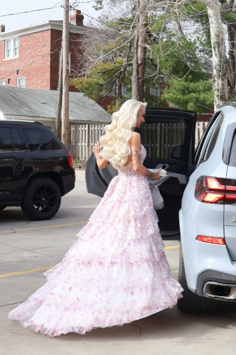 Sophisticated halter gown in lavender tulle adorned with sequins. Features an A-line silhouette with tiered skirt, side slit, and short train for elegant movement. V-neck halter neckline and zip-up back closure complete this full-length formal dress.