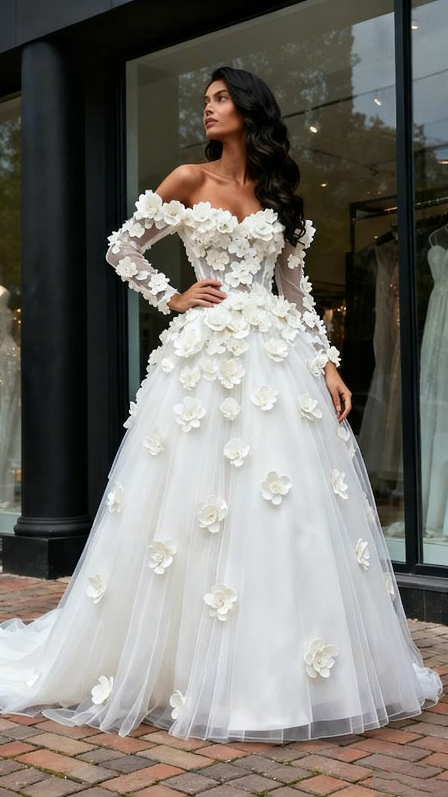 Walk down the aisle in timeless elegance with this exquisite wedding dress. Delicate tulle layered with intricate floral embellishments creates a romantic silhouette, while the off-the-shoulder neckline adds a touch of modern sophistication. Long sleeves provide graceful coverage and a classic bridal aesthetic. The flowing tulle construction offers movement and dimension, ensuring you feel confident and radiant on your special day. A stunning choice for the discerning bride seeking refined beauty and enduring style.