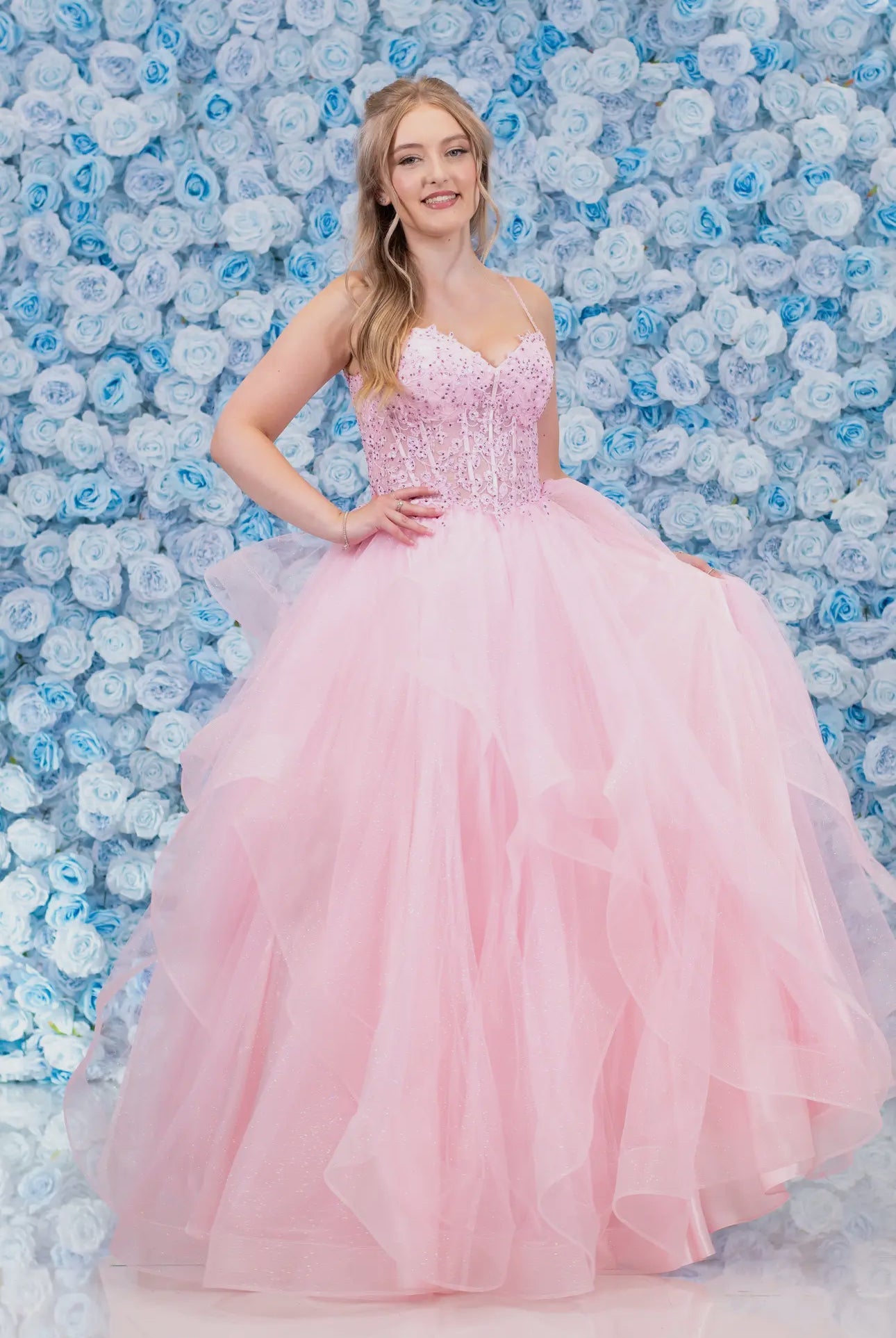 Gorgeous glitter tulle ruffle gown, Semi sheer bodice with lace and gem details, visible boning and satin covered cups. Spaghetti straps and corset tie back. Skirt has zip fastening with hook and eye closure. Horse wire edged ruffle layers on full skirt.