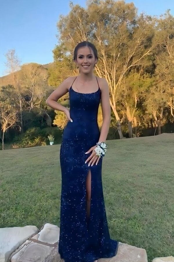 Navy Blue Sequins Mermaid Cross Back Long Prom Dresses With Slit