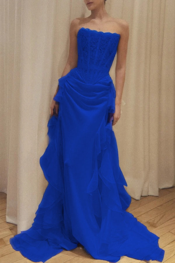 Elegant Strapless Prom Dress Sleeveless Lace with Train