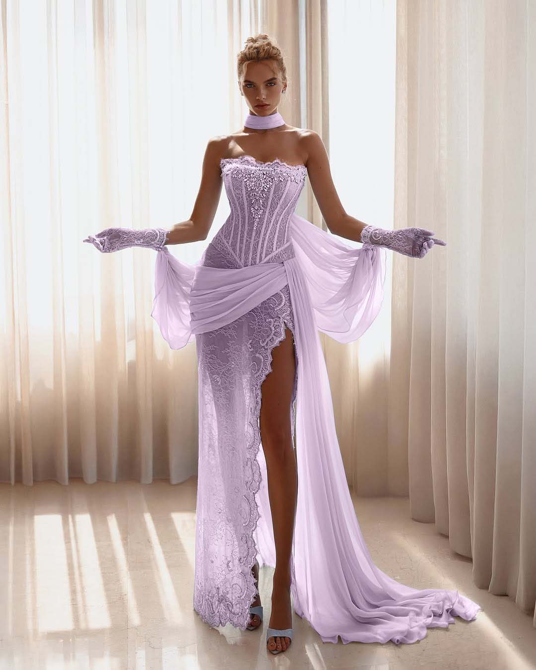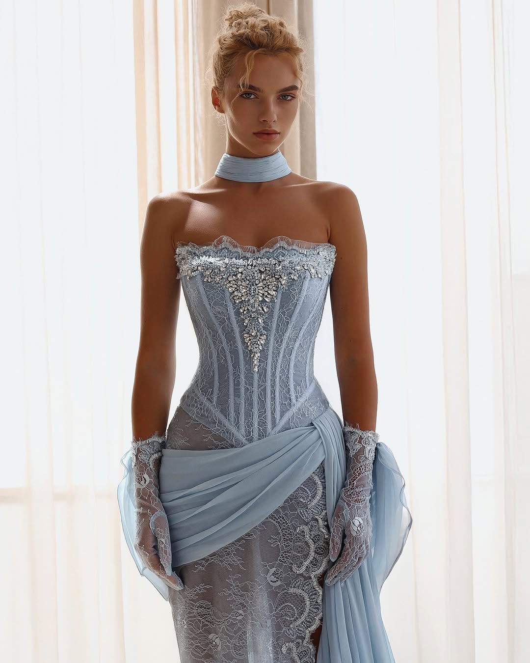 Make a stunning entrance in this sophisticated blue strapless prom dress, expertly crafted with delicate pleated lace detailing and shimmering rhinestone accents. The elegant strapless neckline frames the shoulders beautifully, while the strategic split adds modern allure and graceful movement. Pleated lace construction provides refined texture and dimension, enhanced by sparkling rhinestone embellishments that catch the light with every step. Perfect for prom, formal galas, or black-tie events, this dress combines timeless elegance with contemporary design for an unforgettable evening look.