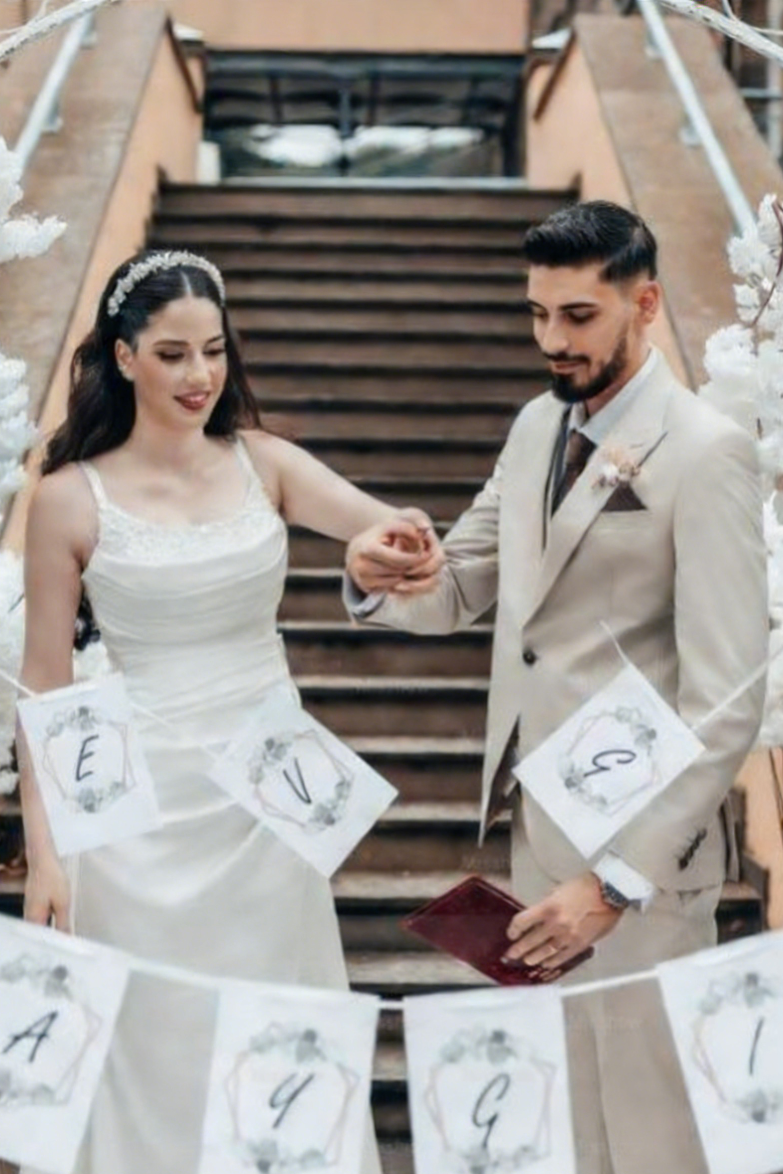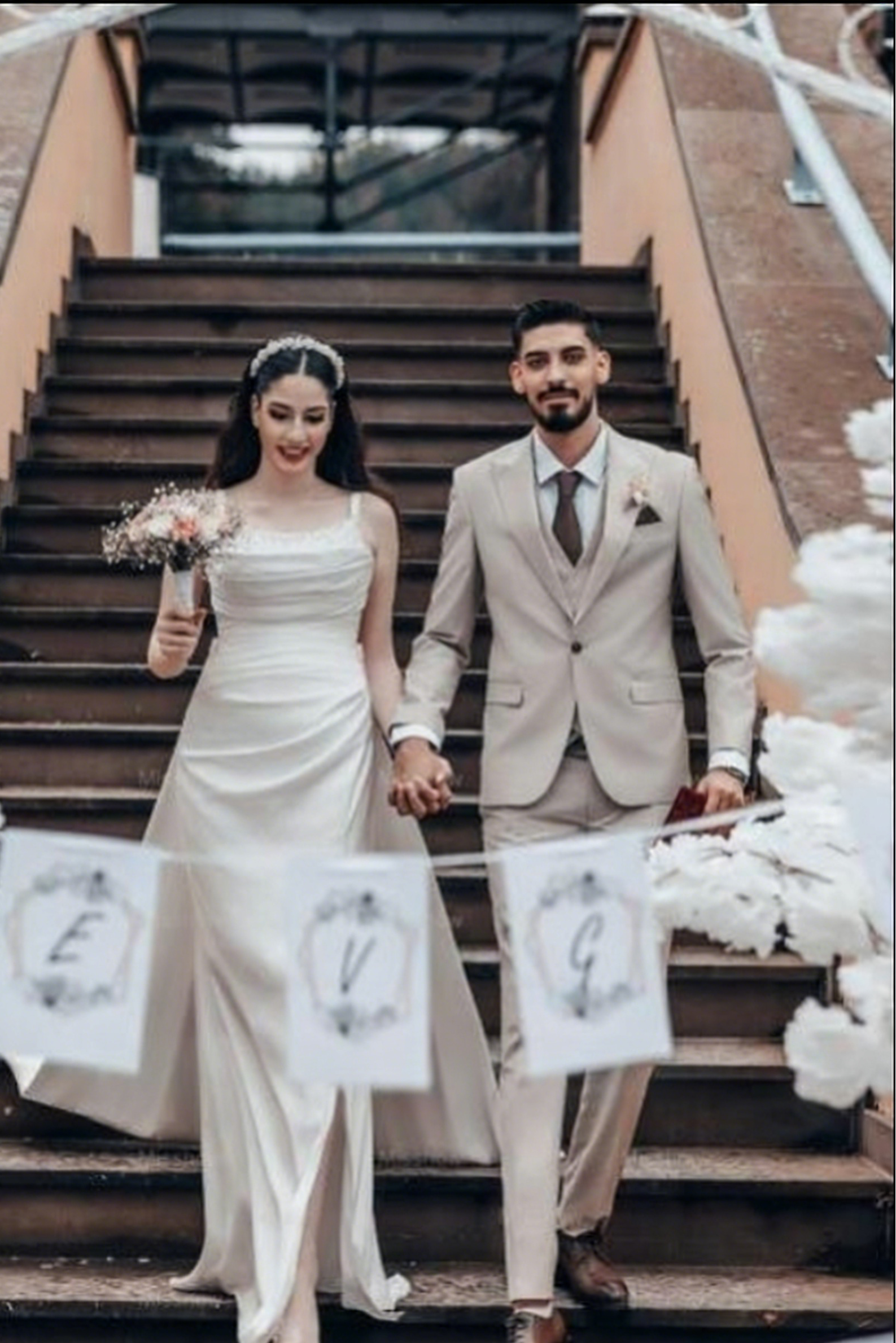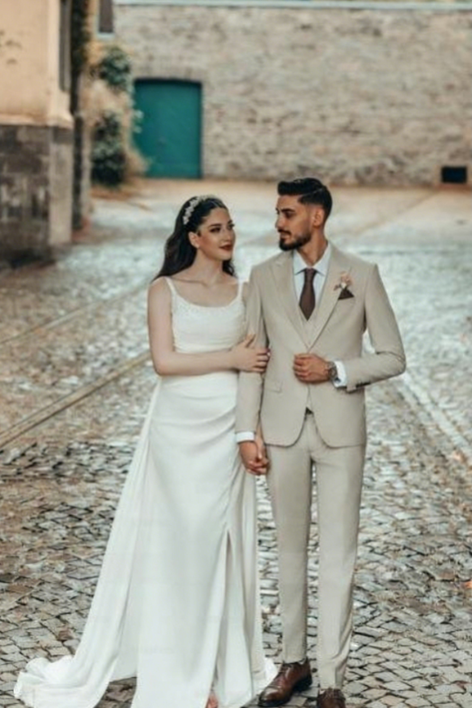 This elegant A-line wedding dress combines timeless romance with modern sophistication. Featuring delicate spaghetti straps and a square neckline, the sleeveless silhouette showcases your shoulders beautifully. Crafted from premium satin with tasteful ruffle details, the gown flows into a dramatic sweep train. The strategic slit adds movement and allure, creating the perfect balance between classic bridal elegance and contemporary style for your special day.