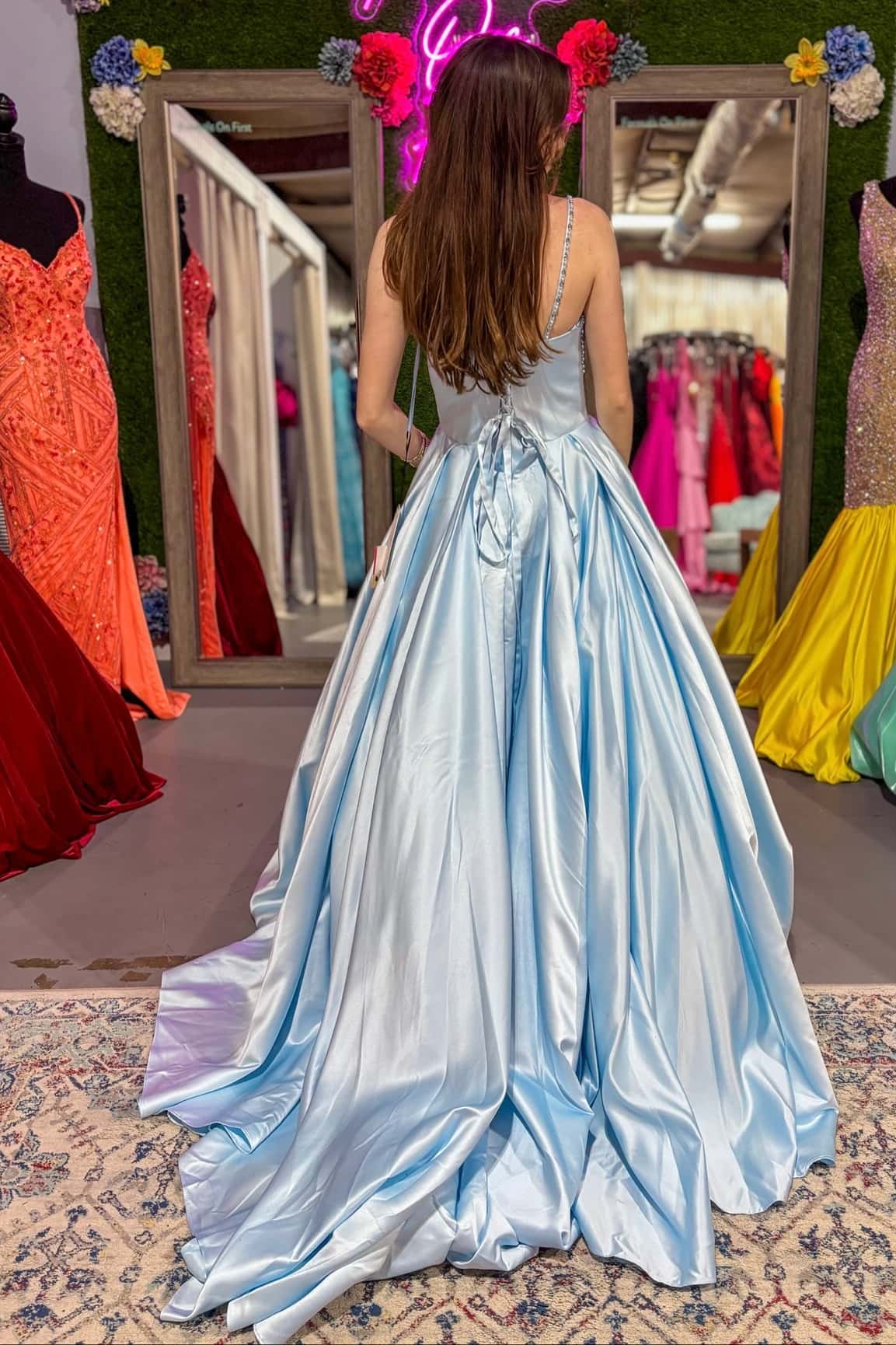 Spaghetti Straps Bateau Maxi Satin A-Line Party Prom Dress