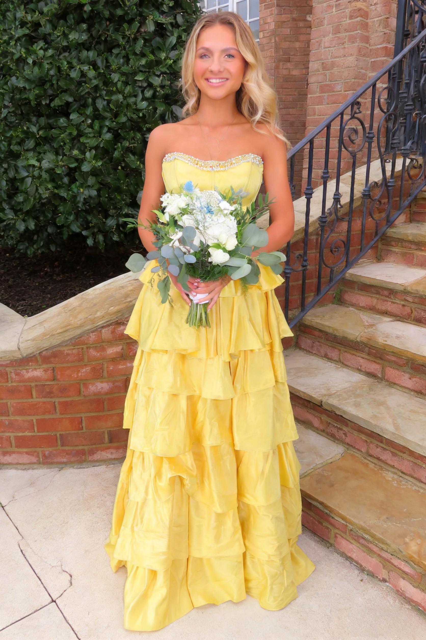 Strapless Yellow Tiered Ruffle Satin Prom Ball Gown
