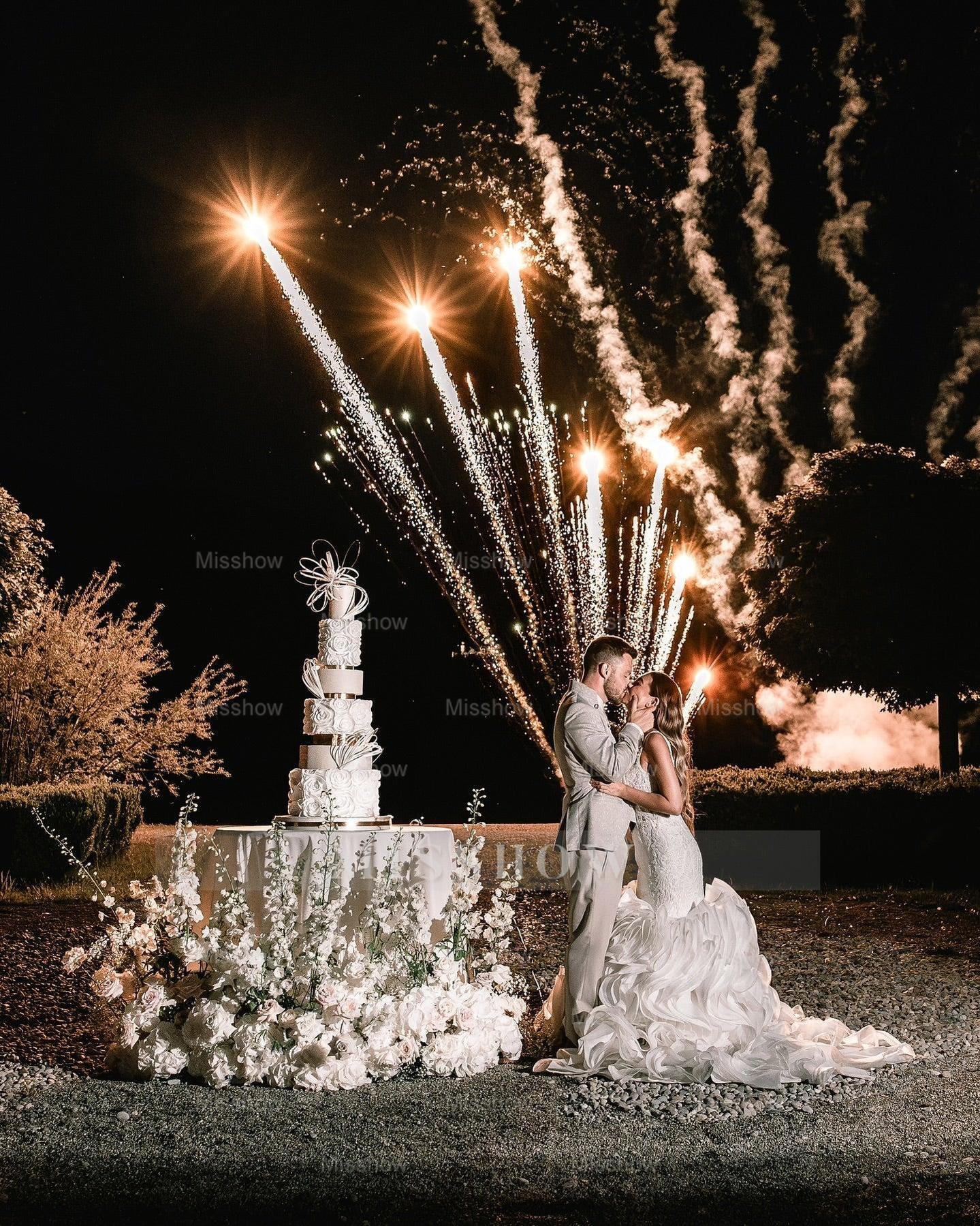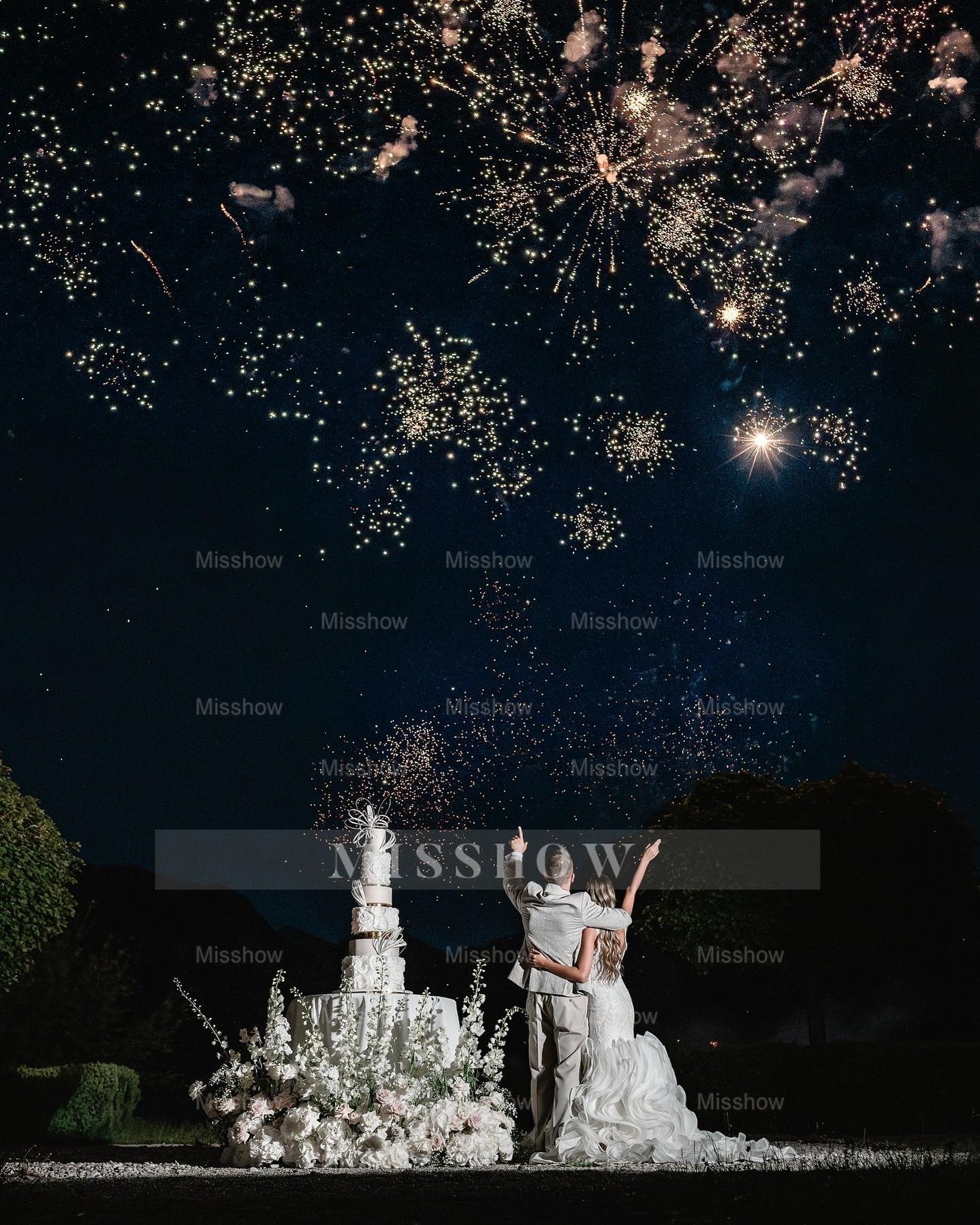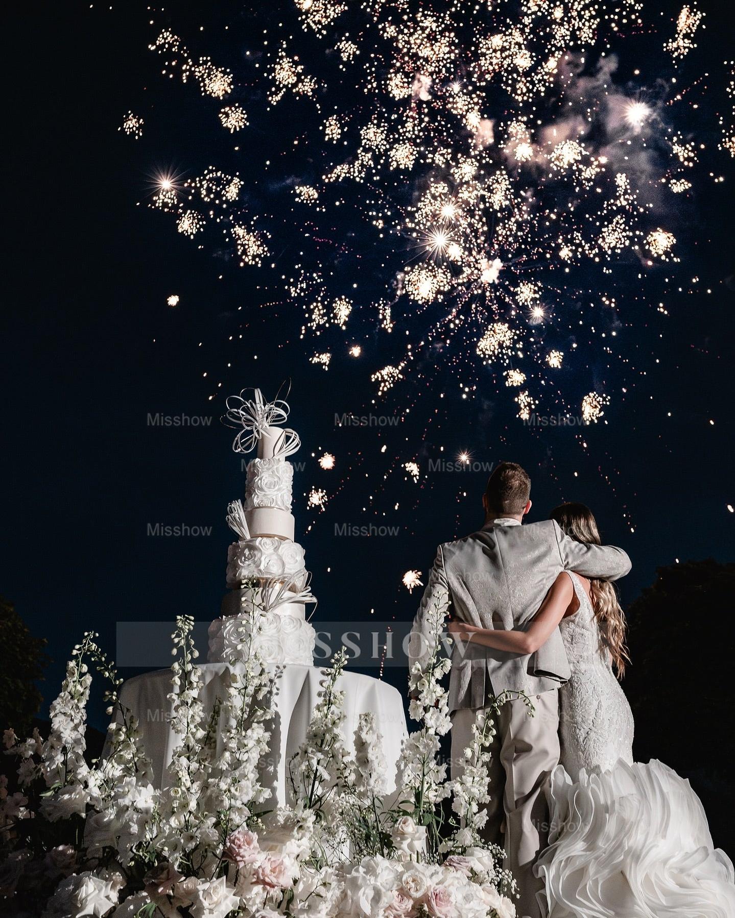 This exquisite white mermaid wedding dress features delicate spaghetti straps and a sleeveless design, perfectly blending elegance with modern style. Crafted from layered organza and adorned with intricate beaded lace, its tiered silhouette enhances a graceful, figure-flattering fit. Ideal for brides seeking a sophisticated and timeless gown that combines detailed craftsmanship with a stunning, long flowing skirt.