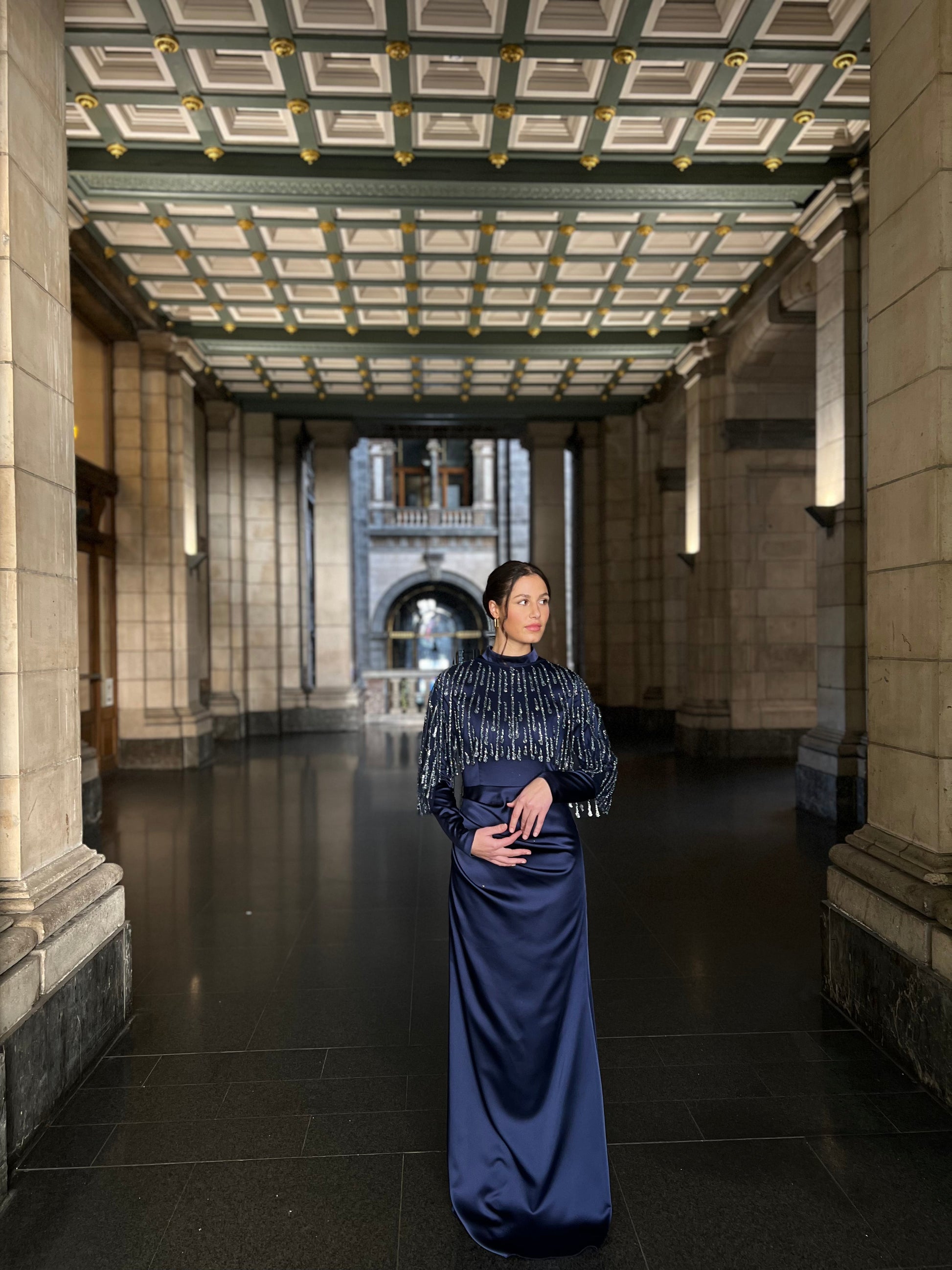 Elevate your formal wardrobe with this sophisticated navy evening dress, designed for those who appreciate refined elegance. The long sleeves provide graceful coverage while intricate beading adds a touch of glamour and dimension to the silhouette. Strategic ruching through the bodice creates a flattering, sculpted fit that enhances your natural curves. The sheath construction offers a sleek, streamlined profile perfect for galas, weddings, and upscale events. A discreet back zipper ensures easy wear and a polished finish. This timeless piece combines classic styling with contemporary details for an unforgettable impression.