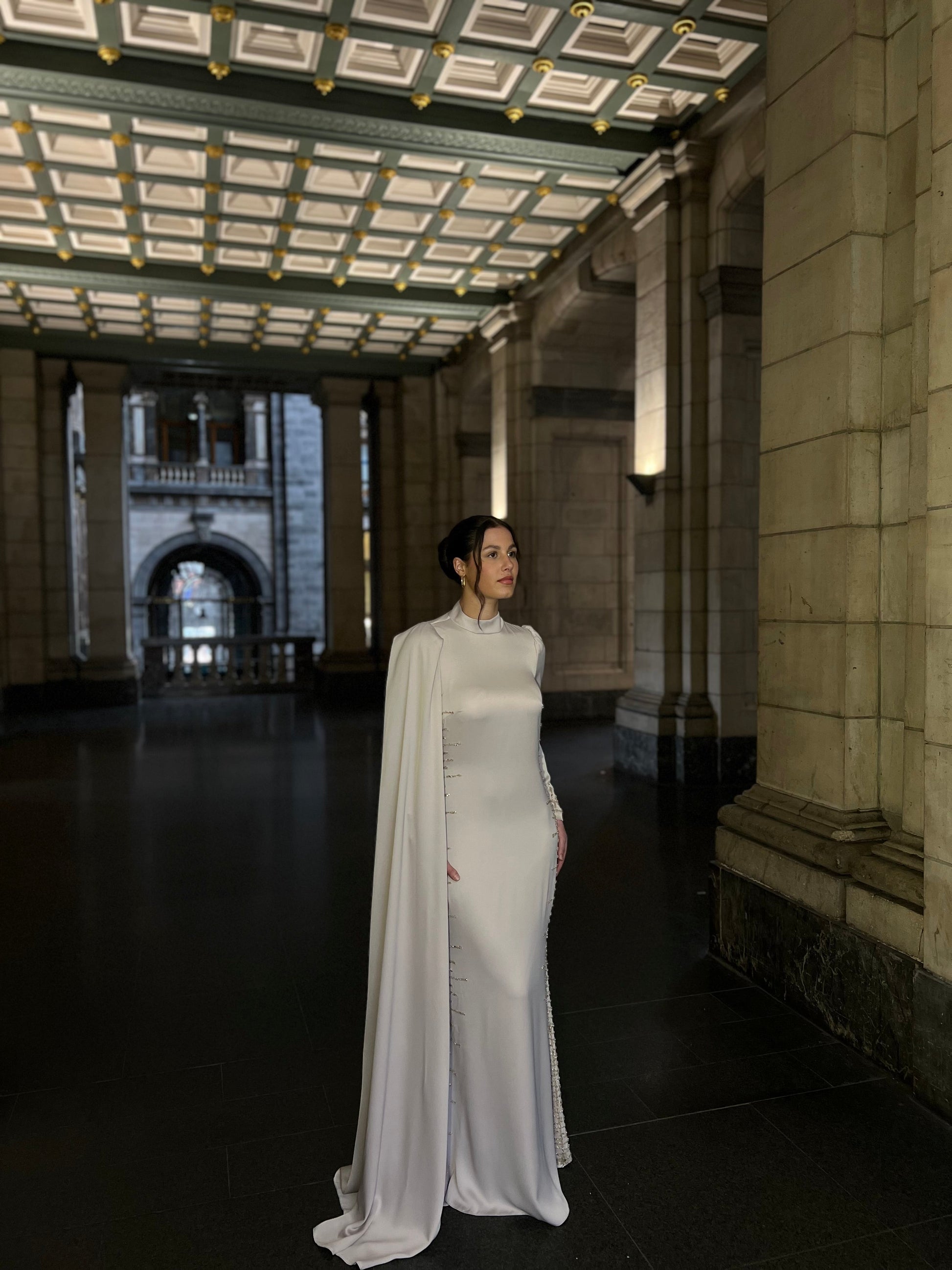 Elevate your formal wardrobe with this sophisticated ivory evening dress, designed for those who appreciate refined elegance. The high neckline and long sleeves provide graceful coverage, while intricate beading details add a touch of luxury and visual interest. The sheath silhouette creates a sleek, flattering line that exudes confidence and poise. Perfect for galas, black-tie events, or upscale celebrations, this dress combines timeless style with contemporary craftsmanship. The ivory tone offers versatility for pairing with various accessories, making it a versatile investment piece for your formal occasions.
